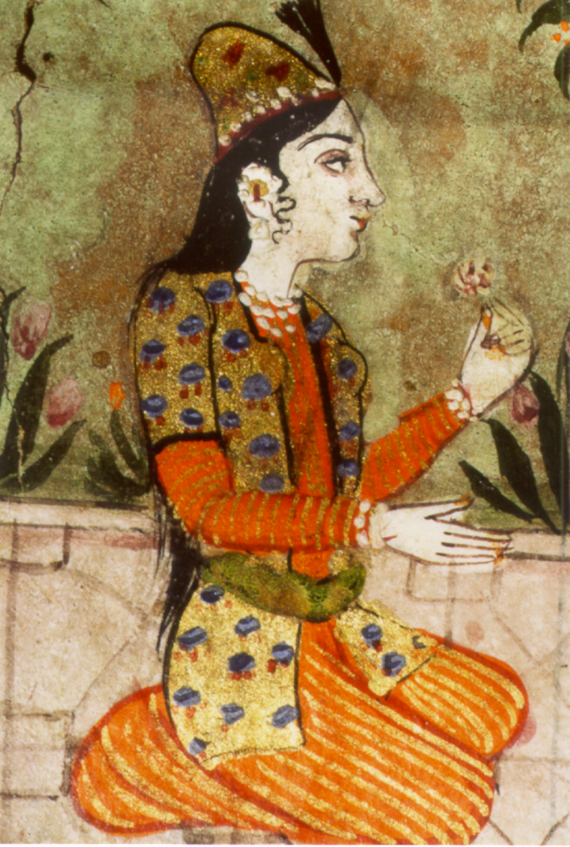 Das Bild der auf einer Terrasse sitzenden Dame, hinter der eine Dienerin mit dem weit verbreiteten Fliegenfächer steht, ist zweifellos vielfältig beeinflußt von europäischen Maltraditionen: angefangen bei dem ovalen Bildformat, der Miniaturgröße, über die Verwendung westlichen Mobilars bis hin zur Art der Farbperspektive im Fernblick über die Terrasse.