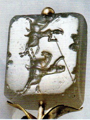Die Geschichte des Cachet aus Afghanistan hat sich 1972 auf dem Markt in Kabul, in dem Dokan von Rausodin und Sadrudin in dem Gebäude des damaligen Planungsministeriums am Pasthunistanplatz zugetragen. Nach Ausage der Händler stammt der Cachet aus Nordafghanistan. Es handelt sich um einen zehnflächigen Cachet (Bodenseite 22 x17 mm; Höhe 13 mm; Vorderseite 7 x 10 mm) in Calcedonischem Blau. Durch eine längliche Lochung kann man ein Band fädeln, so daß man den Cachet um den Hals tragen konnte. Bis 1972 waren weltweit 11 Cachets bekannt. Alle 11 Steine sind von H.Seyrig (Paris) beschrieben. Es wurde versucht, ihn über den Fund des 12 Steines in Kabul zu informieren. Die Meldung kam für ihn 3 Monate zu spät. Der Cachet von Kabul läßt sich in die von H. Seyrig zusammengebrachte und untersuchte Serie hinzufügen. Wir zögern nicht ihn in das gleiche Atelier (der Herstellung) einzuordnen. Er fügt nichts zu dem gewöhnlichen Repertoir der grichisch - persischen Gemmen bei: Tiere, Jagdszenen, Kriegszenen, Personen in verschiedenen Haltungen. Bei der Untersuchung dieses Repertoires, vermutet man das Herkunftsatelier dieser Vielflächner im Südosten Anatoliens, genauer in Lycie und in Carie anzusiedeln. Tatsächlich führen uns die Person auf der oberen Fläche unseres Cachet nach Xanthos (Monument der Nereiden und dem Gebäude G) genau so wie die Jagd- und Kriegszenen den Reliefs des Heroon von Gjölbaschi-Trysa und dem Grab von Payava (auf dem man den kegelförmigen Federhelm des grieschichen Reiters unseres Cachet wiederfindet) ähneln, genau so wie die Bären, die Löwen, die Dammhirsche auf den lygischen Reliefs dargestellt sind, genau sowie die Wildschweine in Form von Skulpturen als auch auf Münzen der Lygier wiederfinden, so sind auch die Stiere auf Münzen dieser Provinz wiederzufinden. Es ist weniger richtig, daß die Einfachheit dieser Stücke in großem Maße den Rahmen der Lygier übertrifft, es genügt sich in Erinnerung zu rufen: die Jagdszenen, Monumente, die genau so bekannt sind wie der Sarkophag der Klageweiber von Sidon, den silbernen Diskus aus dem Schatz des Oxus, den Münzen von Evageras II , das Salamine in Zypern und eine gewisse Anzahl von Gemmen aus Unterasien.