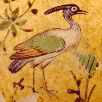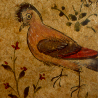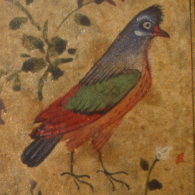Auf zart goldgesprenkeltem Papier wechseln sich Schriftfelder mit blumengeschmückten Zierleisten ab. Die Verse in feinem kalligraphischem Nasta`liq, sind in zwei Kolumnen geschrieben; es kommt vor, daß mehrere Halbverse - vordere und hintere - zusammengefaßt sind. Am Ende jeder Seite sind beide Teile des letzten Verses zusammen in ein mittleres Feld gerückt. so daß beiderseits etwas größere Felder entstehen, in die hinein eine Vielfalt anmutig gemalter - und deutlich voneinander unterscheidbare - Vögel gesetzt sind. Die Verzierung von Textseiten mit derartigen kleinen Bildchen geht in die Zeit des Mogulkaisers Jahangir zurück.