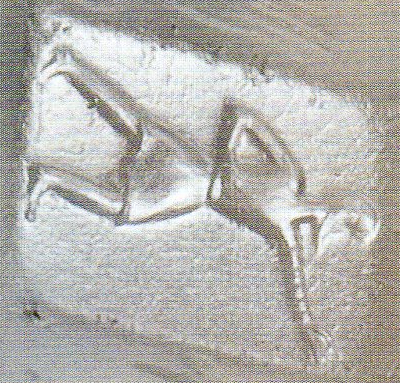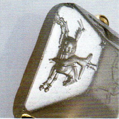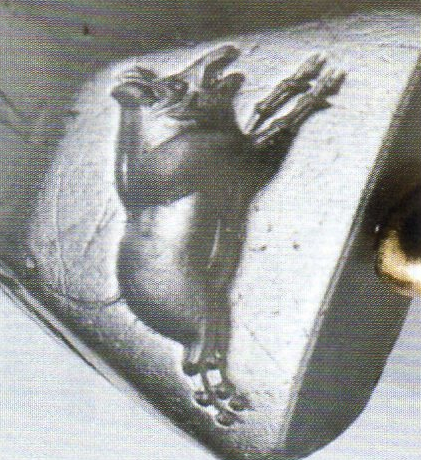 Die Geschichte des Cachet aus Afghanistan hat sich 1972 auf dem Markt in Kabul, in dem Dokan von Rausodin und Sadrudin in dem Gebäude des damaligen Planungsministeriums am Pasthunistanplatz zugetragen. Nach Ausage der Händler stammt der Cachet aus Nordafghanistan. Es handelt sich um einen zehnflächigen Cachet (Bodenseite 22 x17 mm; Höhe 13 mm; Vorderseite 7 x 10 mm) in Calcedonischem Blau. Durch eine längliche Lochung kann man ein Band fädeln, so daß man den Cachet um den Hals tragen konnte. Bis 1972 waren weltweit 11 Cachets bekannt. Alle 11 Steine sind von H.Seyrig (Paris) beschrieben. Es wurde versucht, ihn über den Fund des 12 Steines in Kabul zu informieren. Die Meldung kam für ihn 3 Monate zu spät. Der Cachet von Kabul läßt sich in die von H. Seyrig zusammengebrachte und untersuchte Serie hinzufügen. Wir zögern nicht ihn in das gleiche Atelier (der Herstellung) einzuordnen. Er fügt nichts zu dem gewöhnlichen Repertoir der grichisch - persischen Gemmen bei: Tiere, Jagdszenen, Kriegszenen, Personen in verschiedenen Haltungen. Bei der Untersuchung dieses Repertoires, vermutet man das Herkunftsatelier dieser Vielflächner im Südosten Anatoliens, genauer in Lycie und in Carie anzusiedeln. Tatsächlich führen uns die Person auf der oberen Fläche unseres Cachet nach Xanthos (Monument der Nereiden und dem Gebäude G) genau so wie die Jagd- und Kriegszenen den Reliefs des Heroon von Gjölbaschi-Trysa und dem Grab von Payava (auf dem man den kegelförmigen Federhelm des grieschichen Reiters unseres Cachet wiederfindet) ähneln, genau so wie die Bären, die Löwen, die Dammhirsche auf den lygischen Reliefs dargestellt sind, genau sowie die Wildschweine in Form von Skulpturen als auch auf Münzen der Lygier wiederfinden, so sind auch die Stiere auf Münzen dieser Provinz wiederzufinden. Es ist weniger richtig, daß die Einfachheit dieser Stücke in großem Maße den Rahmen der Lygier übertrifft, es genügt sich in Erinnerung zu rufen: die Jagdszenen, Monumente, die genau so bekannt sind wie der Sarkophag der Klageweiber von Sidon, den silbernen Diskus aus dem Schatz des Oxus, den Münzen von Evageras II , das Salamine in Zypern und eine gewisse Anzahl von Gemmen aus Unterasien.