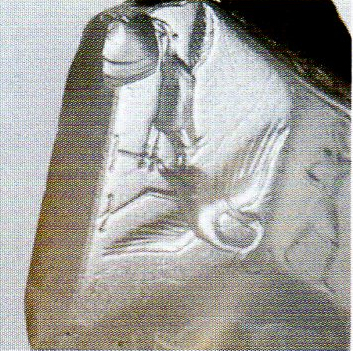 Die Kriegszene auf der unteren Seite des Tiefenreliefs entspricht durch ihre Bearbeitung ähnlichen Szenen, die sich auf anderen zehnseitigen Gemmen befinden. Die Eigentümlichkeit besteht hier darin, daß ein Grieche zu Pferd dargestellt wird anstelle des üblichen Fußsoldaten, wie auf den anderen Cachets mit Kampfszenen. Bei dieser Gelegenheit wird man feststellen, daß der Graveur Hemmungen gehabt haben muß, als er auf so engem Raum das Bild des griechischen Reiters neben dem wild angreifenden stereotypen Perser dargestellt hat.